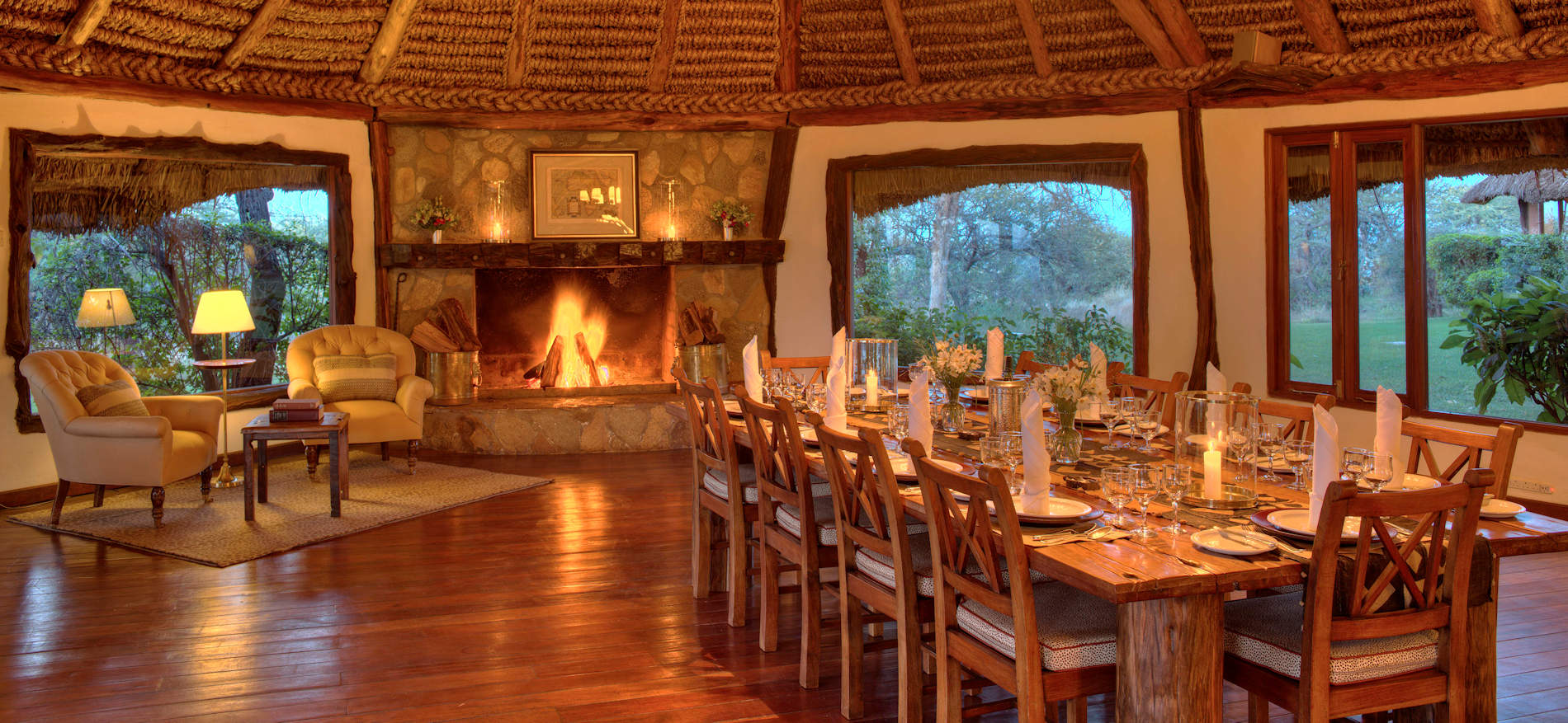 Die elegante Lounge und der Essbereich befinden sich in einem großen ovalen Gebäude mit Steinkaminen an beiden Enden. Auf der einen Seite stehen mehrere cremefarbene Sofas und ein niedriger Couchtisch, an dem sich die Gäste zu einem Drink vor dem Essen versammeln und über den Tag plaudern können, auf der anderen Seite steht ein klobiger Holztisch, der für das gemeinsame Essen ausgelegt ist.
