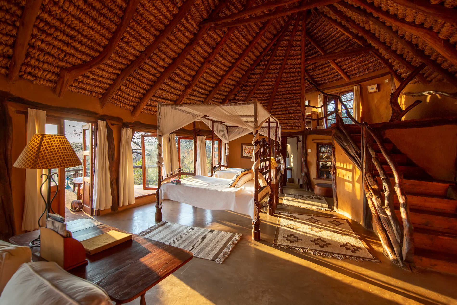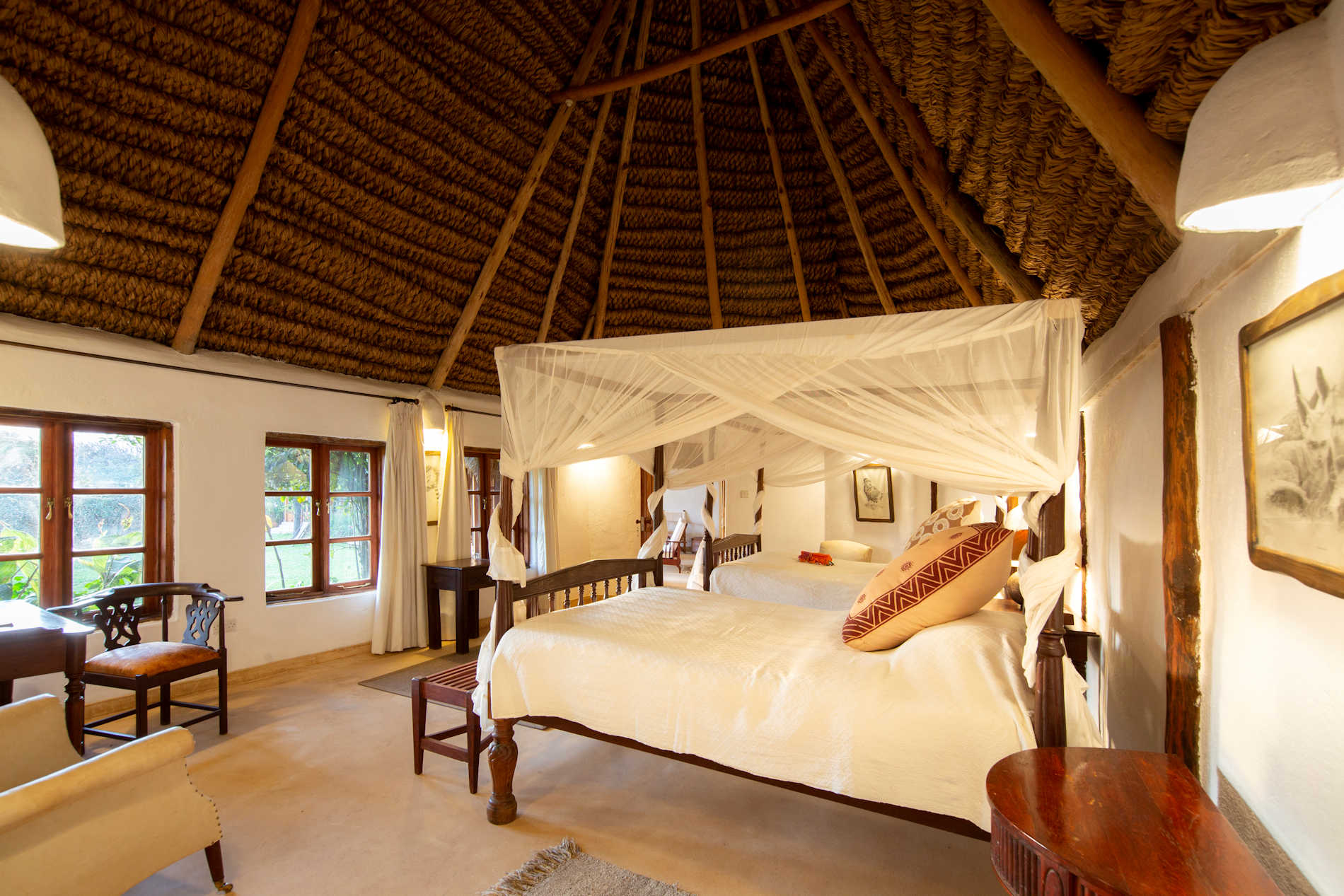 Im Laufe der Zeit wurden die Zelte in Lewa Wilderness durch feste Steinhütten ersetzt. Jedes dieser neun Cottages ist anders, aber alle sind sehr geräumig und haben ein rustikales Flair, mit rauen Steinwänden und polierten Steinböden. Die klobigen Holzmöbel und gewebten Teppiche, die in der Werkstatt vor Ort hergestellt werden, werden durch weichere Sessel und Sofas ausgeglichen, die ein fast englisches Landhausgefühl vermitteln.
