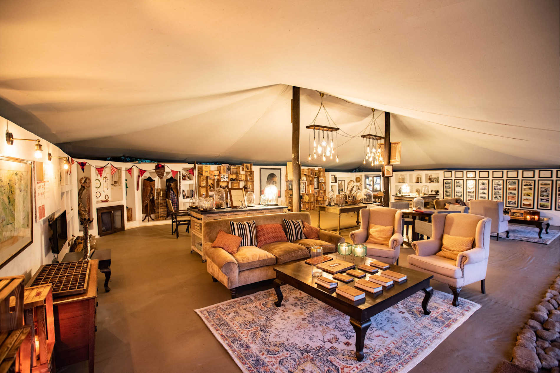 Der zentrale Bereich ist ein sehr großes, offenes Messe- und Lounge-Zelt, das vor einem gepflegten Rasen steht. Der gemütliche Lounge-Bereich ist mit Sesseln, Couchtischen und Sofas ausgestattet. An den Wänden hängen alte Sepia-Fotos und von der Decke hängen Messinglaternen – man fühlt sich wirklich in die Vergangenheit zurückversetzt. Am anderen Ende steht ein großer Esstisch, an dem die gemeinsamen Mahlzeiten eingenommen werden.