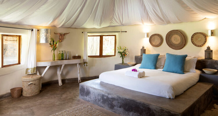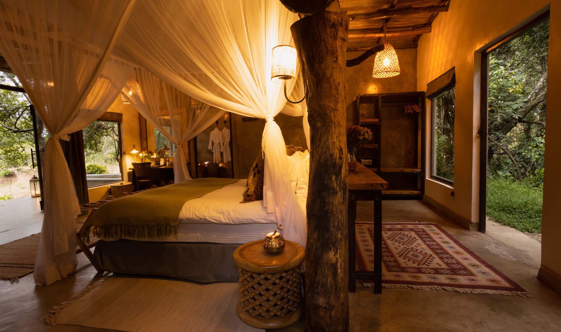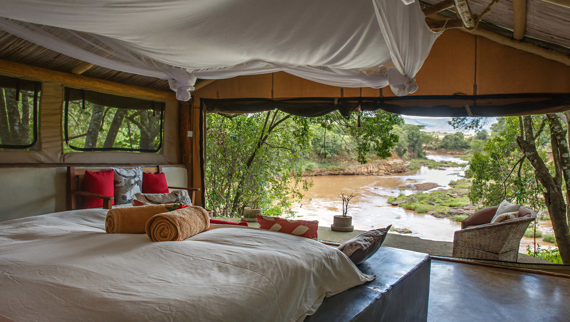 Jedes Cottage wurde mit nachhaltigen Materialien gebaut und bietet Annehmlichkeiten wie handgefertigte Möbel, en-suite Badezimmer und private Veranden mit Blick auf den Mara-Fluss.
