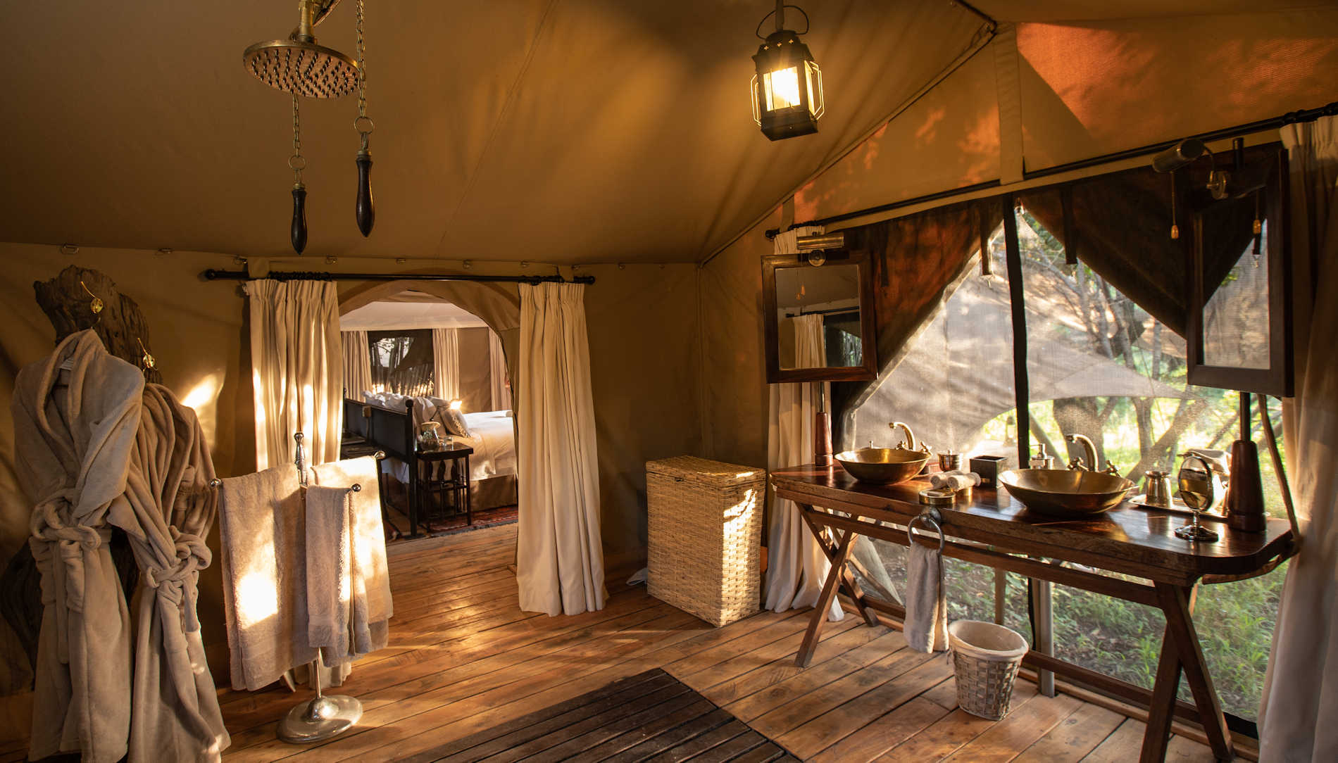 Die schweren handgearbeiteten Mahagonimöbel und die Innenausstattung sind ganz im kolonialen Entdecker Stil gehalten. Jedes Zelt hat seine eigene Veranda, um Ihnen den besten Ein- und Ausblick ins Wildlife vor den Zelten zu geben.