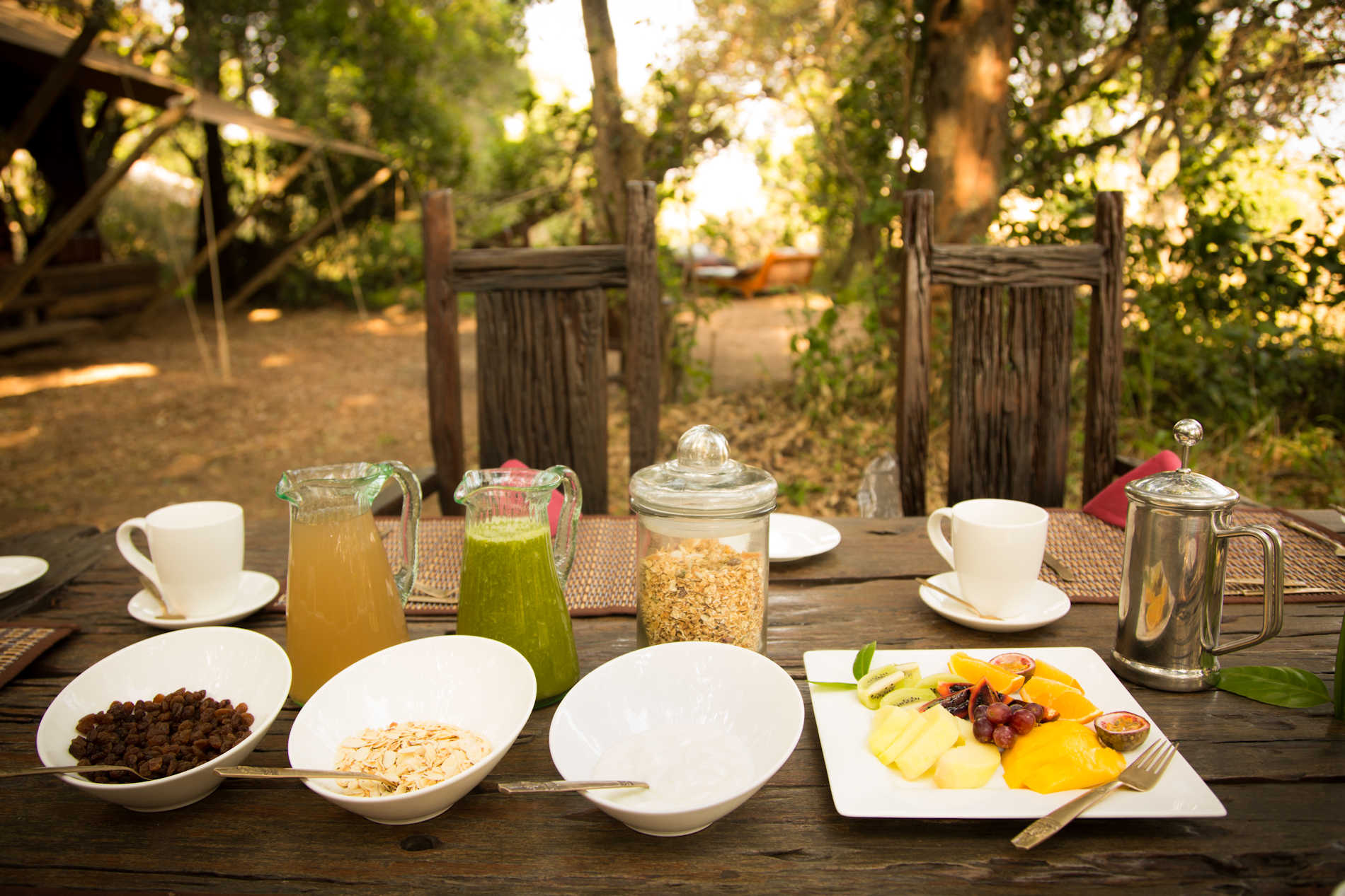 Frühstück und Mittagessen werden in der Regel im Freien vor dem Essenszelt eingenommen, wo sich die Gäste auch vor dem Abendessen zu einem Drink um die Feuerstelle versammeln. Es gibt auch ein bequemes Tagesbett und eine Reihe von Regiestühlen am Fluss – ein entspannender Ort zwischen den Safari-Aktivitäten.