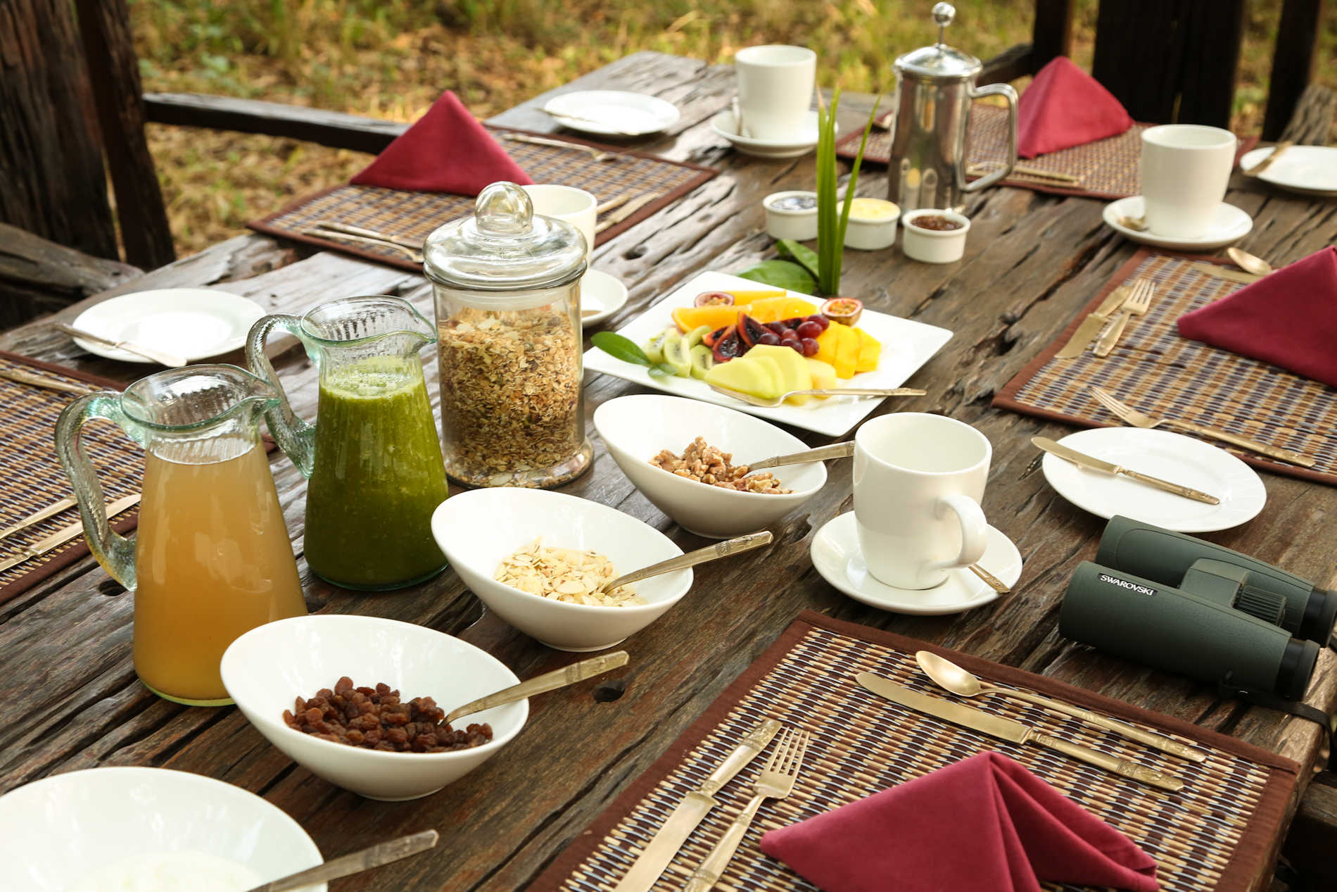 Wie die Schlafzelte bietet auch das zentrale Essenszelt einen Blick auf den schmalen Fluss und ist in ähnlichem Stil dekoriert, mit dunklen Holztruhen, prächtigen Leder- und Perlenbodenkissen, Messinglampen und Perserteppichen. Auf der einen Seite des Zeltes befindet sich eine Sitzecke, auf der anderen ein großer Tisch, an dem in geselliger Runde gegessen wird.