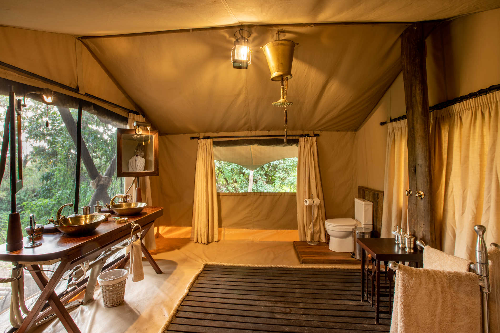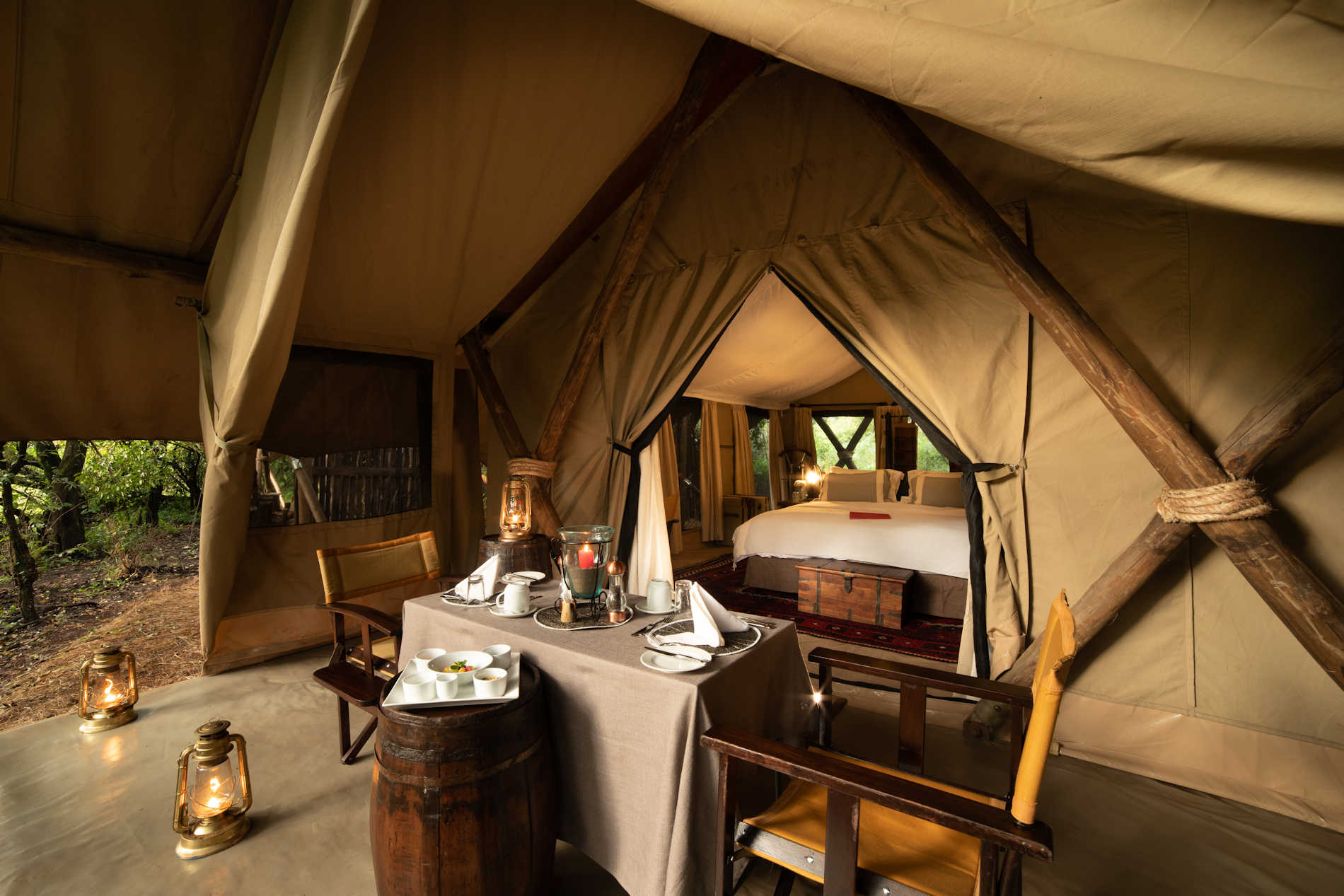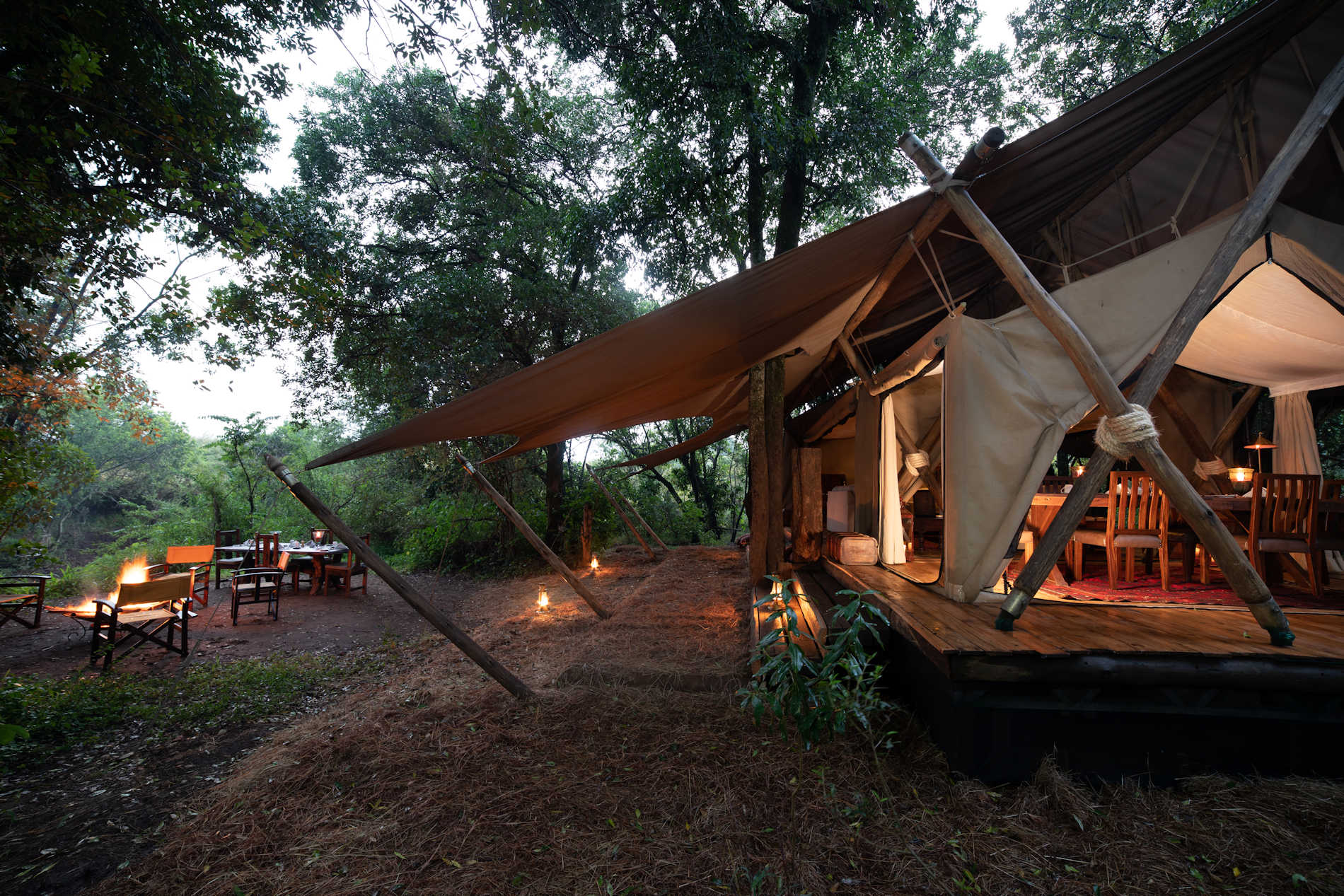 Die 4 hellen, luftigen und geräumigen Zelte aus Segeltuch sind jeweils mit eigenem Bad ausgestattet, in dem Sie heißes Wasser aus riesigen Messing-Safari-Duschen genießen. Die Zelte ermöglichen eine große Privatsphäre mit gutem Abstand zueinander. Unter dem Hain aus afrikanischen Ebenholzbäumen ist der bescheidene Hauptbereich mit Laternen- und Kerzenlicht beleuchtet, einfach gestaltet, aber gerade ausreichend für alle Annehmlichkeiten. Das Ambiente dieses Camps Ambiente und sein klassisches Safaridesign sind etwas Besonderes bei individualreisenden Safariliebhabern.