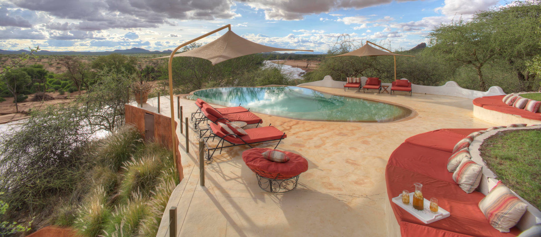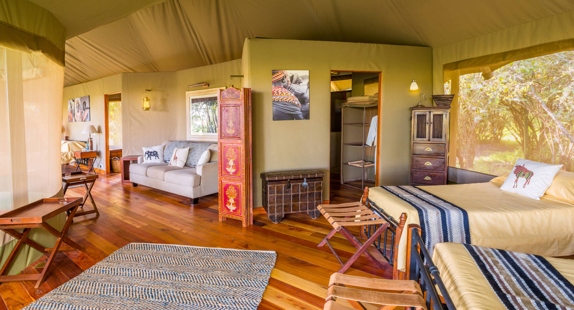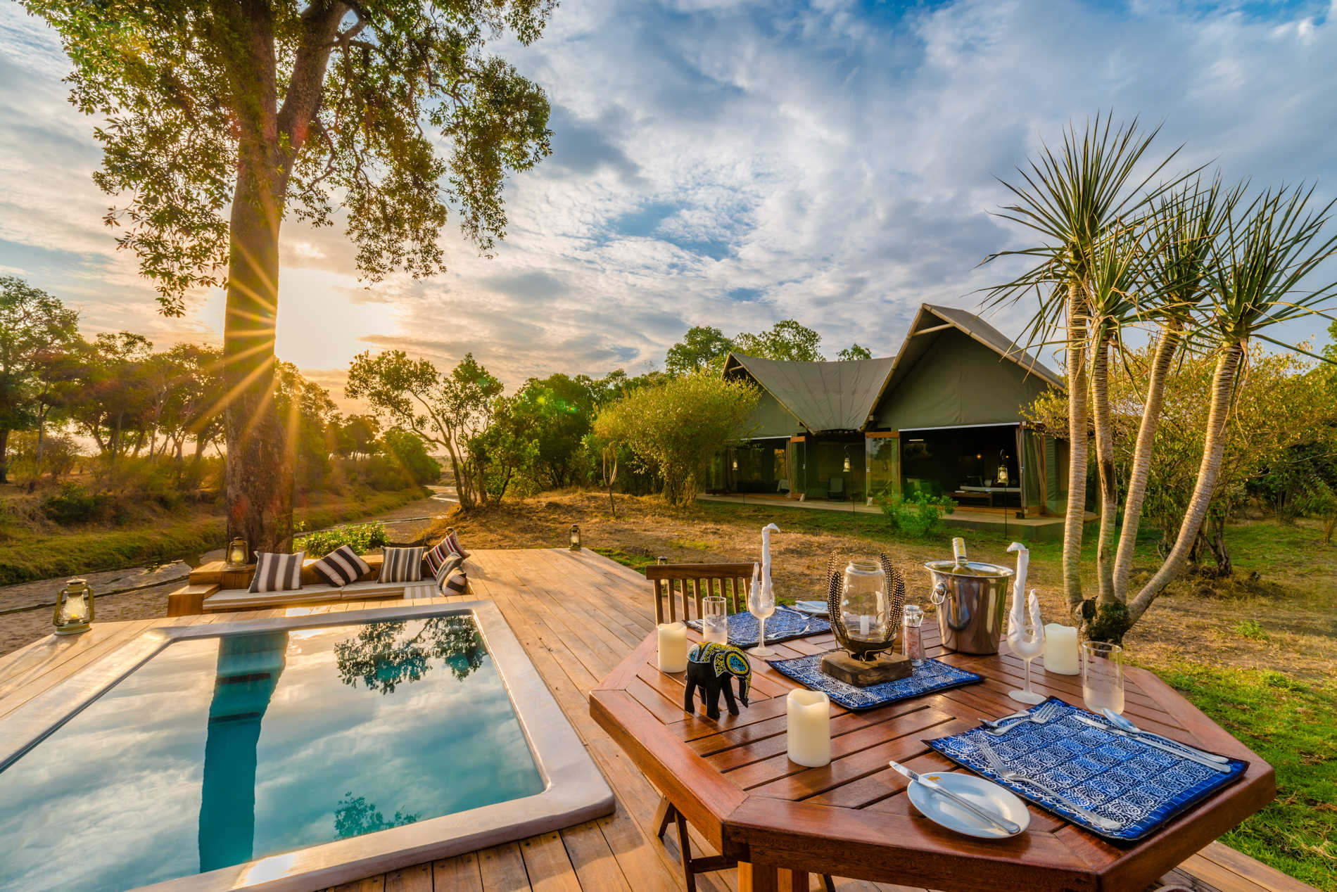 Das Sala’s Camp liegt in der Masai Mara direkt am Sand River, der die meiste Zeit des Jahres trocken ist, mit Blick nach Tanzania zur Serengeti. Das Camp grenzt an das zukünftige Nashornschutzgebiet an.