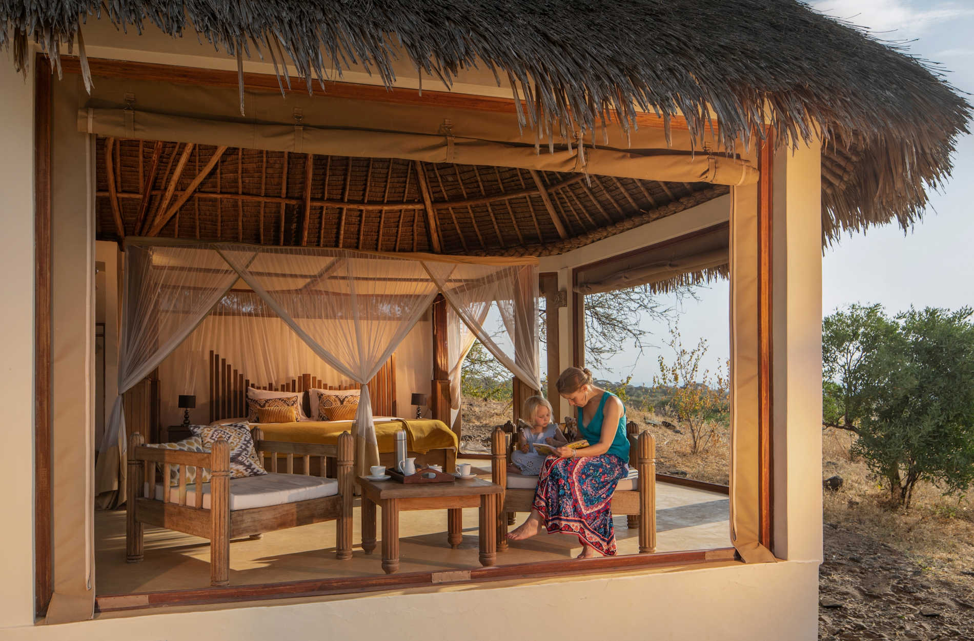 Die Unterkunft bietet Platz für bis zu 16 Gäste in sechs Villen, darunter zwei Familieneinheiten. Jede der geräumigen strohgedeckten Villen ist auf einem soliden Sockel mit einem soliden Rahmen und Zeltwänden gebaut, die sich vollständig aufrollen lassen, um eine Villa mit offener Front zu schaffen.
